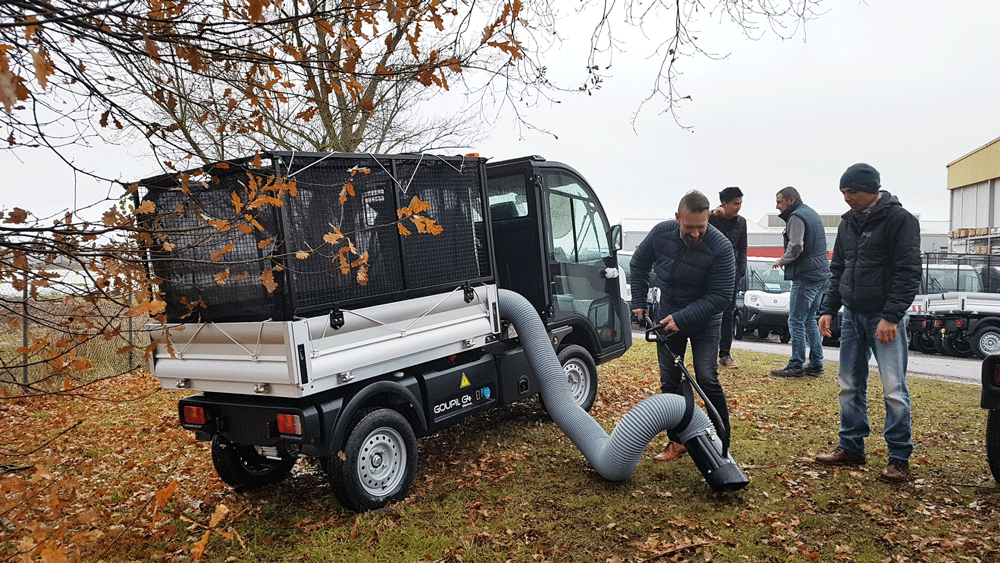 Goupil offers a great range of 100 % electric equipment for their vehicles, including the leaf collector.