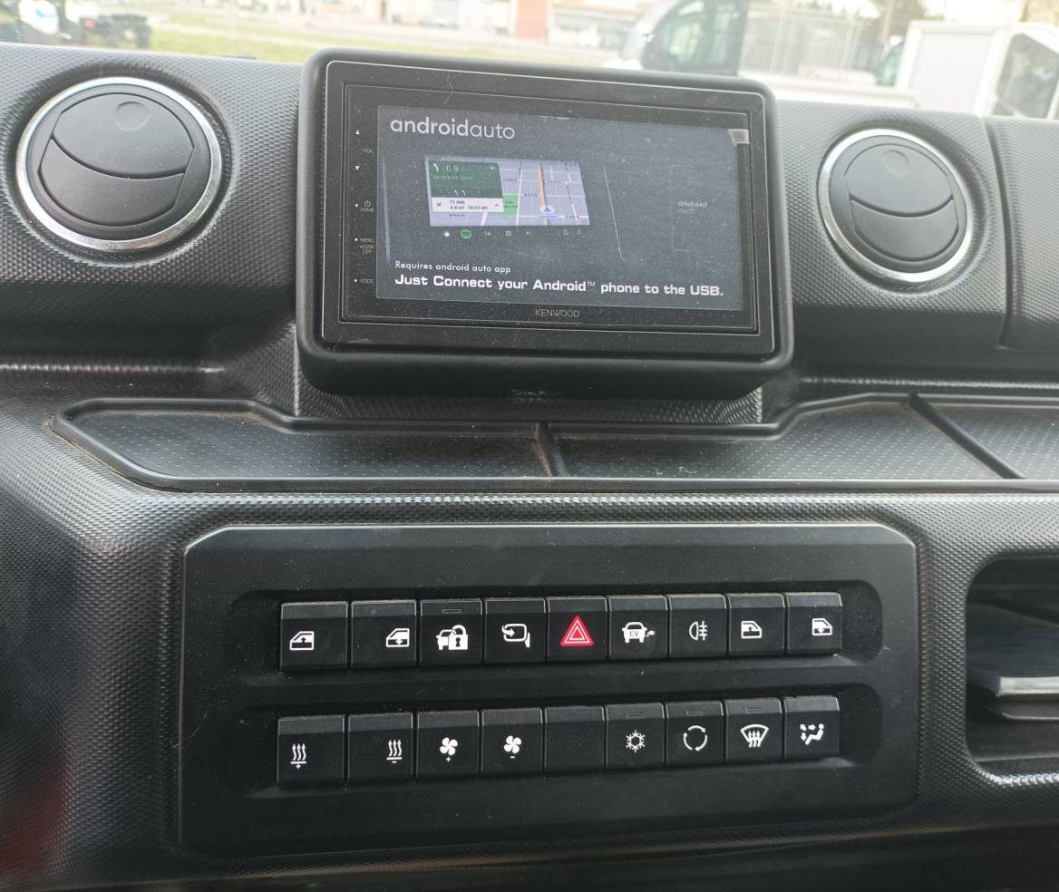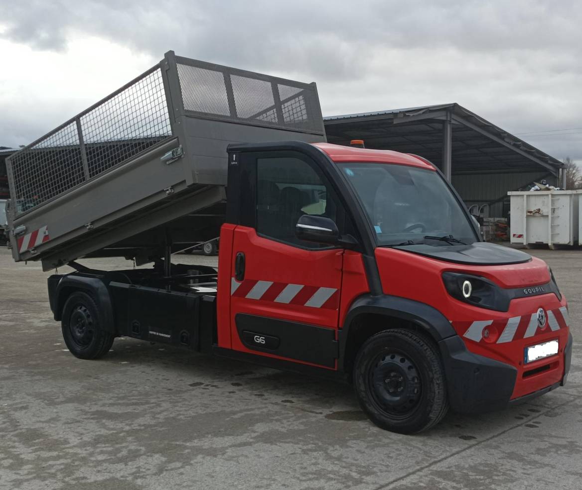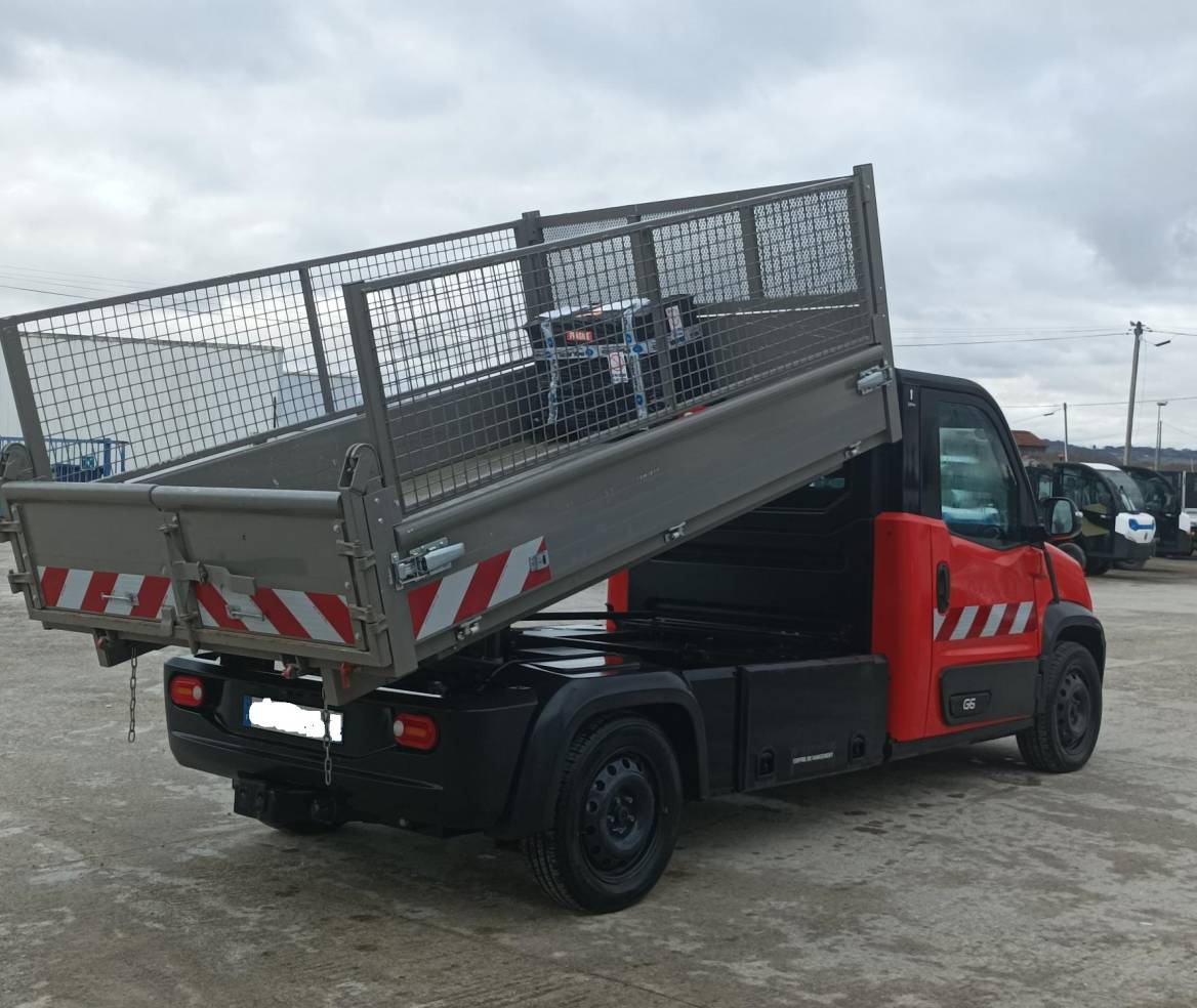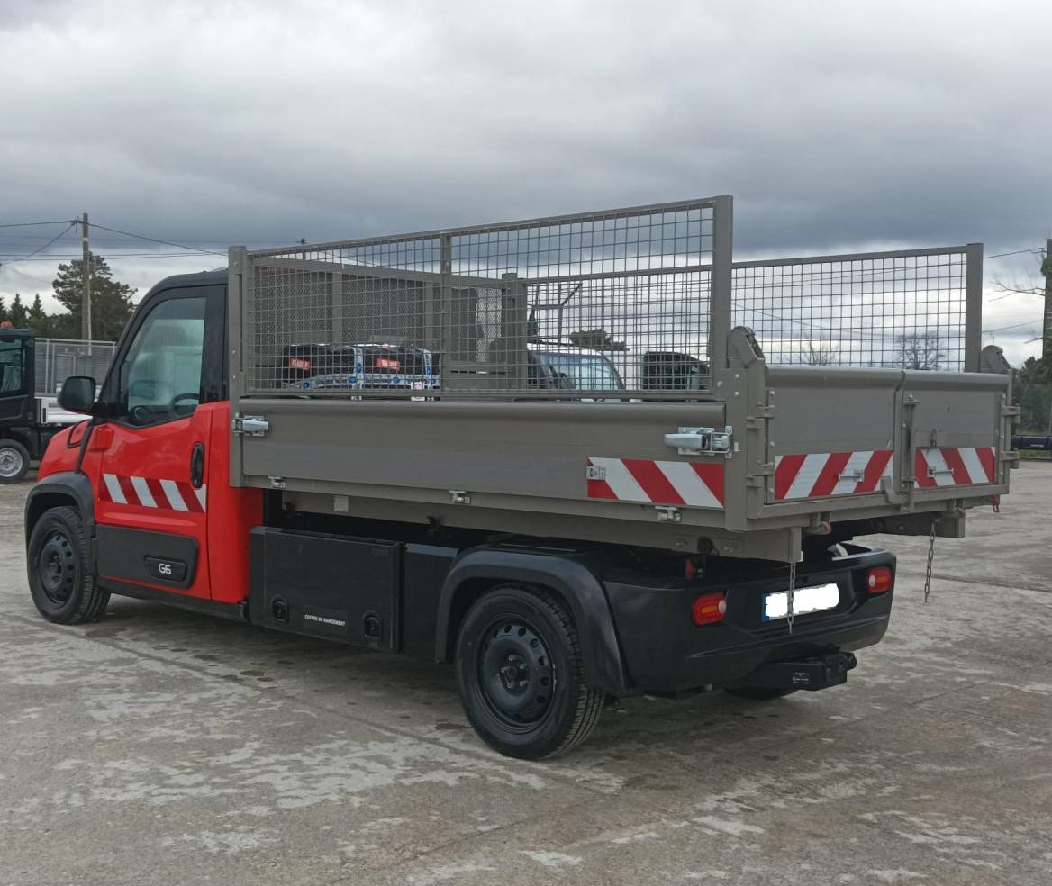 Benne basculante avec rehausses grillagées et portes vantaux arrières à décrochement automatique · Cabine couleur rouge RAL 3020 avec pare-brise chauffant et direction assistée · Climatisation reversible l 1800 W, fermeture centralisée, double DIN (autoradio/afficheur/caméra), radar avant et caméra de recul, bouton métier · Bandes réfléchissantes l classe 2 feux avant / arrière de pénétration, et feu à éclats · Cordon de charge 5m mode 3 type 2/type 2, coffre de rangement transversal
